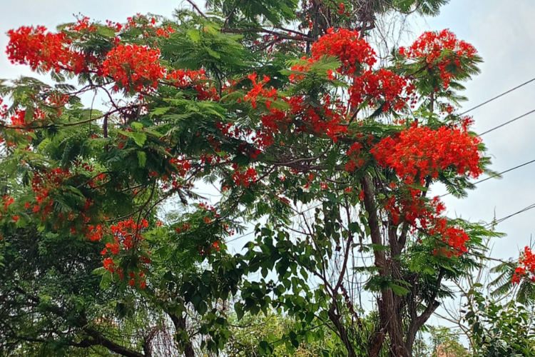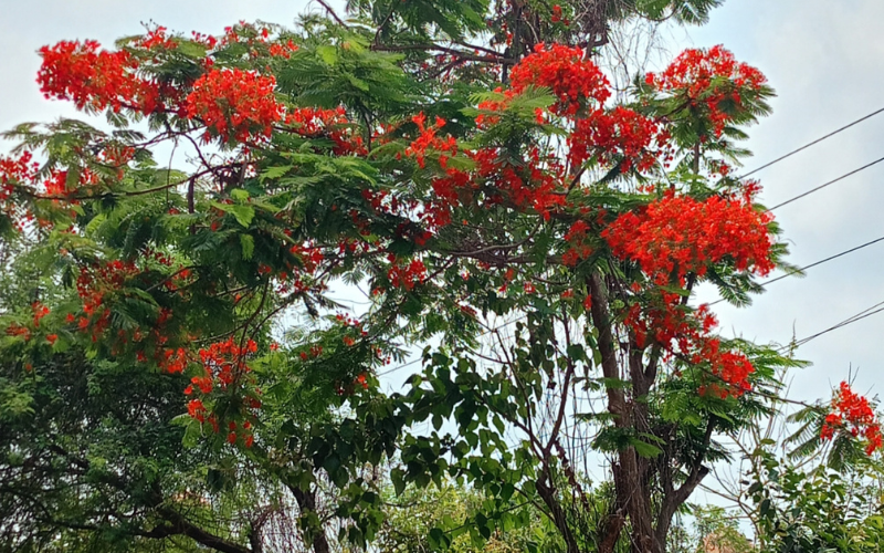 মাথা উঁচু করে দাঁড়িয়ে আছে একটা বিশাল কৃষ্ণচূড়া গাছ। সারা গাছ জুড়ে উজ্জ্বল লাল ফুলের মেলা। এমন সুন্দর দৃশ্য দেখে বুকটা ভরে গেল। প্রখর রোদে যে ফুলগুলো এত উজ্জ্বল, মেঘলা আকাশেও তাদের সৌন্দর্য যেন আরও বেশি চোখ ধাঁধানো।