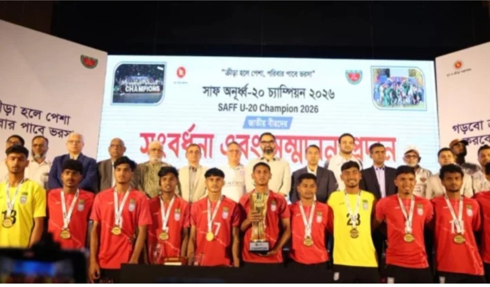 সাফ অনূর্ধ্ব-২০ চ্যাম্পিয়নশিপের শিরোপা জেতা বাংলাদেশ ফুটবল দলকে আনুষ্ঠানিক সংবর্ধনা ও আর্থিক পুরস্কার দিয়েছে সরকার।