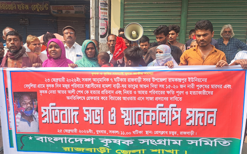 বুধবার (২৫ ফেব্রুয়ারি) দুপুরে রাজবাড়ী প্রেসক্লাবের সামনের সড়কে বাংলাদেশ কৃষক সংগ্রাম সমিতি, রাজবাড়ী জেলা শাখার উদ্যোগে আয়োজিত প্রতিবাদ সভা ও স্মারকলিপি প্রদান কর্মসূচিতে অংশ নেয় তিন শিশু। তাদের সঙ্গে শতাধিক মানুষ কর্মসূচিতে অংশ নেন।