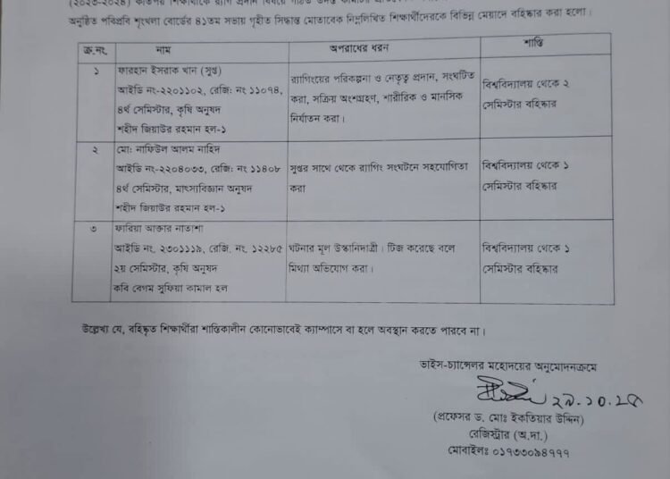 বিশ্ববিদ্যালয়ের শৃঙ্খলা বোর্ডের ৪১তম সভায় গৃহীত সিদ্ধান্ত অনুযায়ী কৃষি অনুষদের চতুর্থ বর্ষের শিক্ষার্থী ফারহান ইসরাক খান সুপ্তকে দুই সেমিস্টারের জন্য, মাৎস্য বিজ্ঞান অনুষদের চতুর্থ বর্ষের মো. নাফিউল আলম নাহিদকে এক সেমিস্টারের জন্য এবং কৃষি অনুষদের দ্বিতীয় সেমিস্টারের শিক্ষার্থী ফারিয়া আক্তার নাতাশাকে এক সেমিস্টারের জন্য বহিষ্কার করা হয়েছে।
