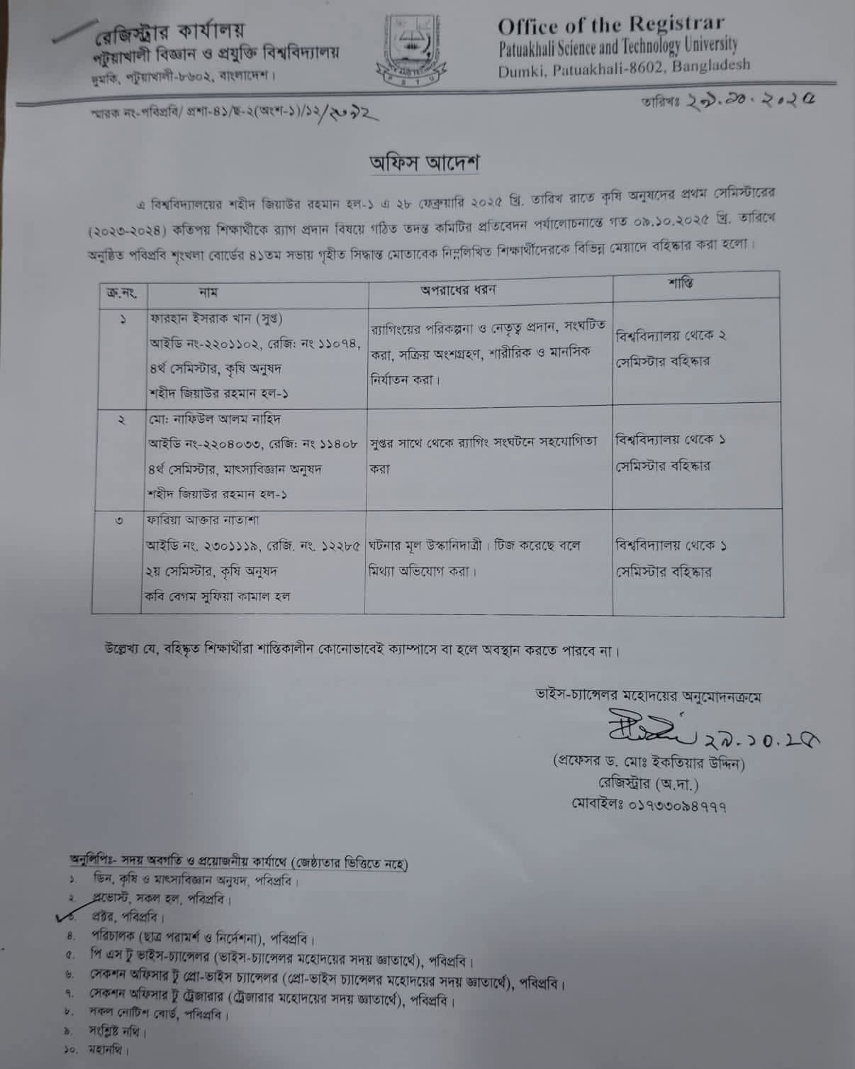 বিশ্ববিদ্যালয়ের শৃঙ্খলা বোর্ডের ৪১তম সভায় গৃহীত সিদ্ধান্ত অনুযায়ী কৃষি অনুষদের চতুর্থ বর্ষের শিক্ষার্থী ফারহান ইসরাক খান সুপ্তকে দুই সেমিস্টারের জন্য, মাৎস্য বিজ্ঞান অনুষদের চতুর্থ বর্ষের মো. নাফিউল আলম নাহিদকে এক সেমিস্টারের জন্য এবং কৃষি অনুষদের দ্বিতীয় সেমিস্টারের শিক্ষার্থী ফারিয়া আক্তার নাতাশাকে এক সেমিস্টারের জন্য বহিষ্কার করা হয়েছে।