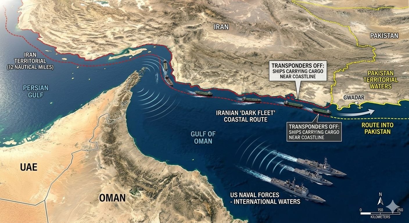প্রযুক্তিগতভাবে ইরান জাহাজগুলোর অটোমেটিক আইডেন্টিফিকেশন সিস্টেম বা ট্রান্সপন্ডার (AIS) পুরোপুরি বন্ধ করে দিচ্ছে। এর ফলে গ্লোবাল শিপিং ম্যাপে জাহাজগুলো শনাক্ত করা প্রায় অসম্ভব হয়ে পড়ে। সাগরের হাজারো সাধারণ নৌকার ভিড়ে কোনটি পণ্যবাহী আর কোনটি তেলের ট্যাংকার, তা দূরপাল্লার রাডার দিয়ে বোঝা দুষ্কর। এছাড়া মাকরান উপকূলের দুর্গম পাহাড়ি খাঁড়িতে জাহাজগুলো লুকিয়ে থেকে মার্কিন ড্রোনের নজরদারি ফাঁকি দিচ্ছে। একবার জাহাজগুলো পাকিস্তান বা ভারতের জলসীমায় ঢুকে পড়লে সার্বভৌমত্ব এবং কূটনৈতিক সম্পর্কের খাতিরে আমেরিকা সেখানে আর কোনো হস্তক্ষেপ করতে পারছে না।