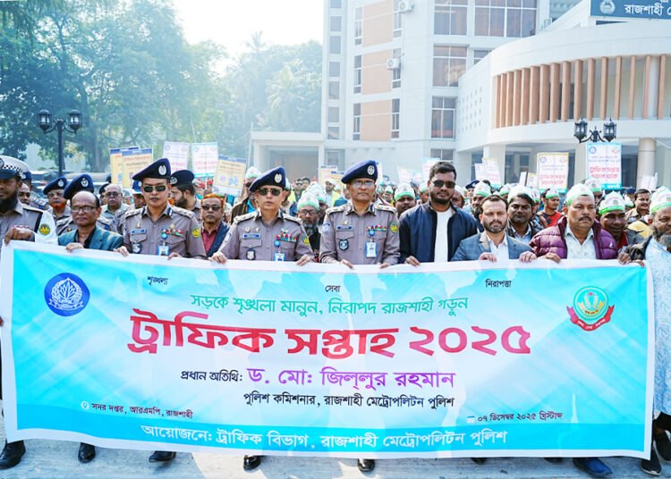 ‘সড়কে শৃঙ্খলা মানুন, নিরাপদ রাজশাহী গড়ুন’ প্রতিপাদ্য নিয়ে রাজশাহী মেট্রোপলিটন পুলিশের (আরএমপি) উদ্যোগে ট্রাফিক সপ্তাহ-২০২৫ উদ্বোধন করা হয়েছে। আজ রোববার (৭ডিসেম্বর) সকাল সাড়ে ১০টায় আরএমপি সদর দপ্তরের সামনে প্রধান অতিথি হিসেবে ফেস্টুন ও বেলুন উড়িয়ে ট্রাফিক সপ্তাহের উদ্বোধন করেন পুলিশ কমিশনার ড. মো. জিল্লুর রহমান।