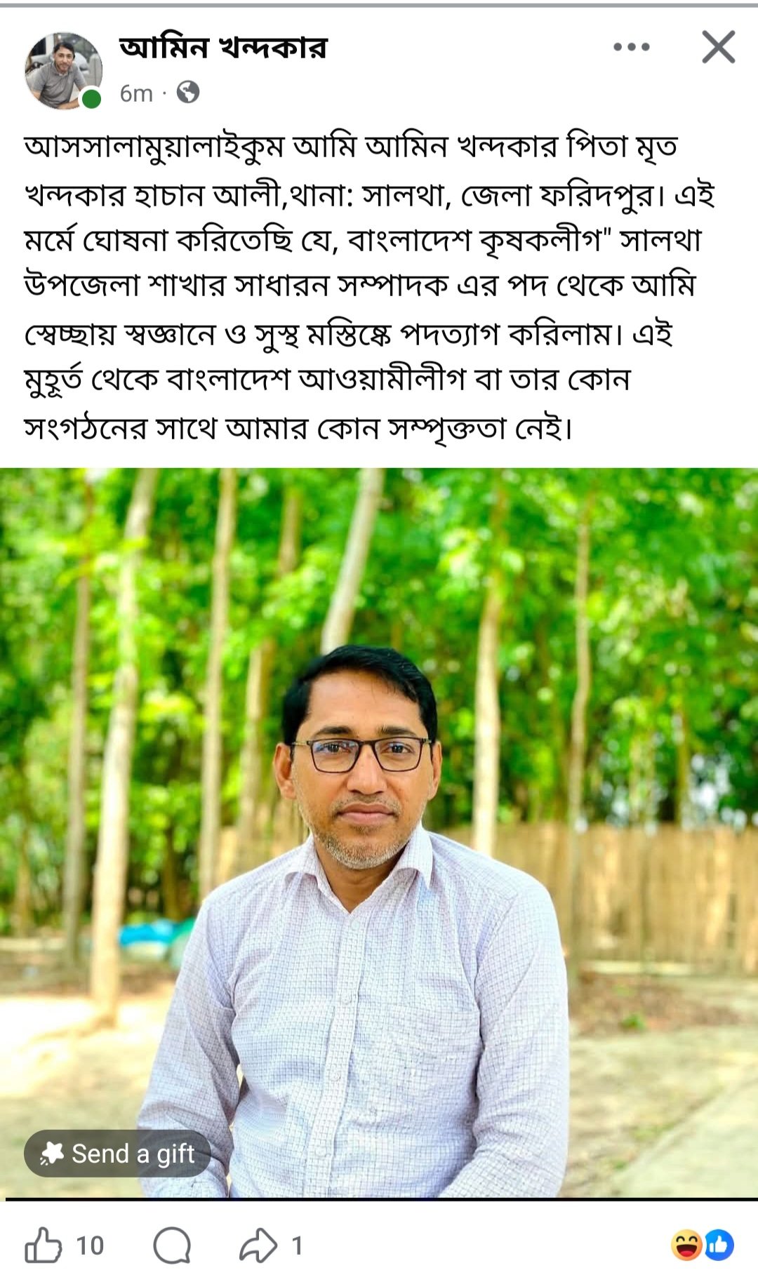 পদত্যাগ করা উপজেলা কৃষকলীগের সাধারণ সম্পাদক আমিন খন্দকার নিজের পরিচয় দিয়ে ফেসবুক লিখেন, এই মর্মে ঘোষনা করিতেছি যে, কৃষকলীগের সালথা উপজেলা শাখার সাধারন সম্পাদক এর পদ থেকে স্বেচ্ছায় স্বজ্ঞানে সুস্থ মস্তিষ্কে পদত্যাগ করিলাম। এই মুহূর্ত থেকে বাংলাদেশ আওয়ামীলীগ বা তার কোন সংগঠনের সাথে আমার কোন সমপৃক্ততা নেই।