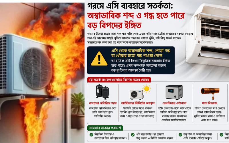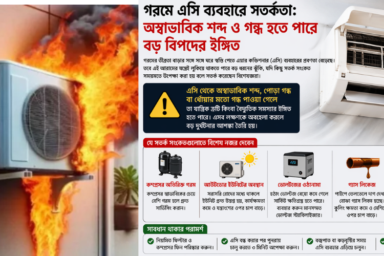 তাদের মতে, এসি চালানোর সময় অস্বাভাবিক শব্দ, পোড়া গন্ধ বা ধোঁয়ার মতো গন্ধ পাওয়া গেলে তা যান্ত্রিক ত্রুটি কিংবা বৈদ্যুতিক সমস্যার ইঙ্গিত হতে পারে। এসব লক্ষণকে হালকাভাবে নিলে বড় দুর্ঘটনার আশঙ্কা তৈরি হয়।