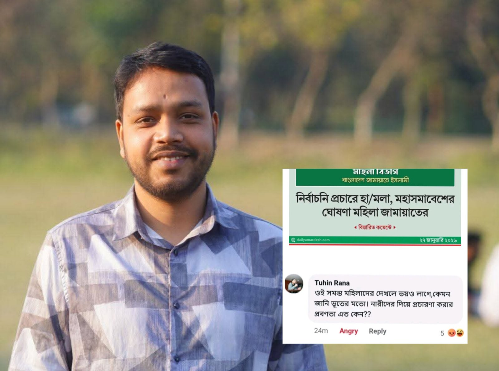 মঙ্গলবার (২৭ জানুয়ারি) বিশ্ববিদ্যালয় শাখা ইসলামী ছাত্রশিবিরের সভাপতি এম সুমন সরকারের ফেসবুক ওয়ালে শেয়ার করা একটি সংবাদে মন্তব্য করেন তুহিন রানা। সংবাদটির শিরোনাম ছিল, “নির্বাচনি প্রচারে হামলা, মহাসমাবেশের ঘোষণা মহিলা জামায়াতের।” সেখানে কমেন্টে তিনি লেখেন, “ওই সমস্ত মহিলাদের দেখলে ভয়ও লাগে, কেমন জানি ভূতের মতো। নারীদের দিয়ে প্রচারণা করার প্রবণতা এত কেন??”