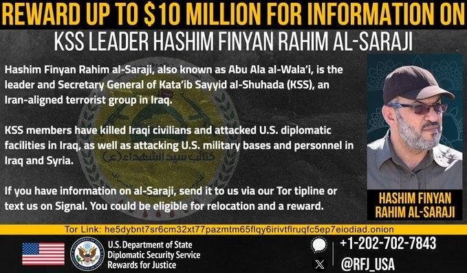 ইরাকে অবস্থানরত ইরান সমর্থিত শক্তিশালী শিয়া মিলিশিয়া গোষ্ঠী ‘কাতায়িব সাইয়্যেদ আল-শুহাদা’ (কেএসএস)-এর প্রধান হাশিম ফিনিয়ান রহিম আল-সরাজির সন্ধান বা তথ্য দিতে পারলে ১ কোটি মার্কিন ডলার পুরস্কার দেওয়ার ঘোষণা দিয়েছে যুক্তরাষ্ট্র।