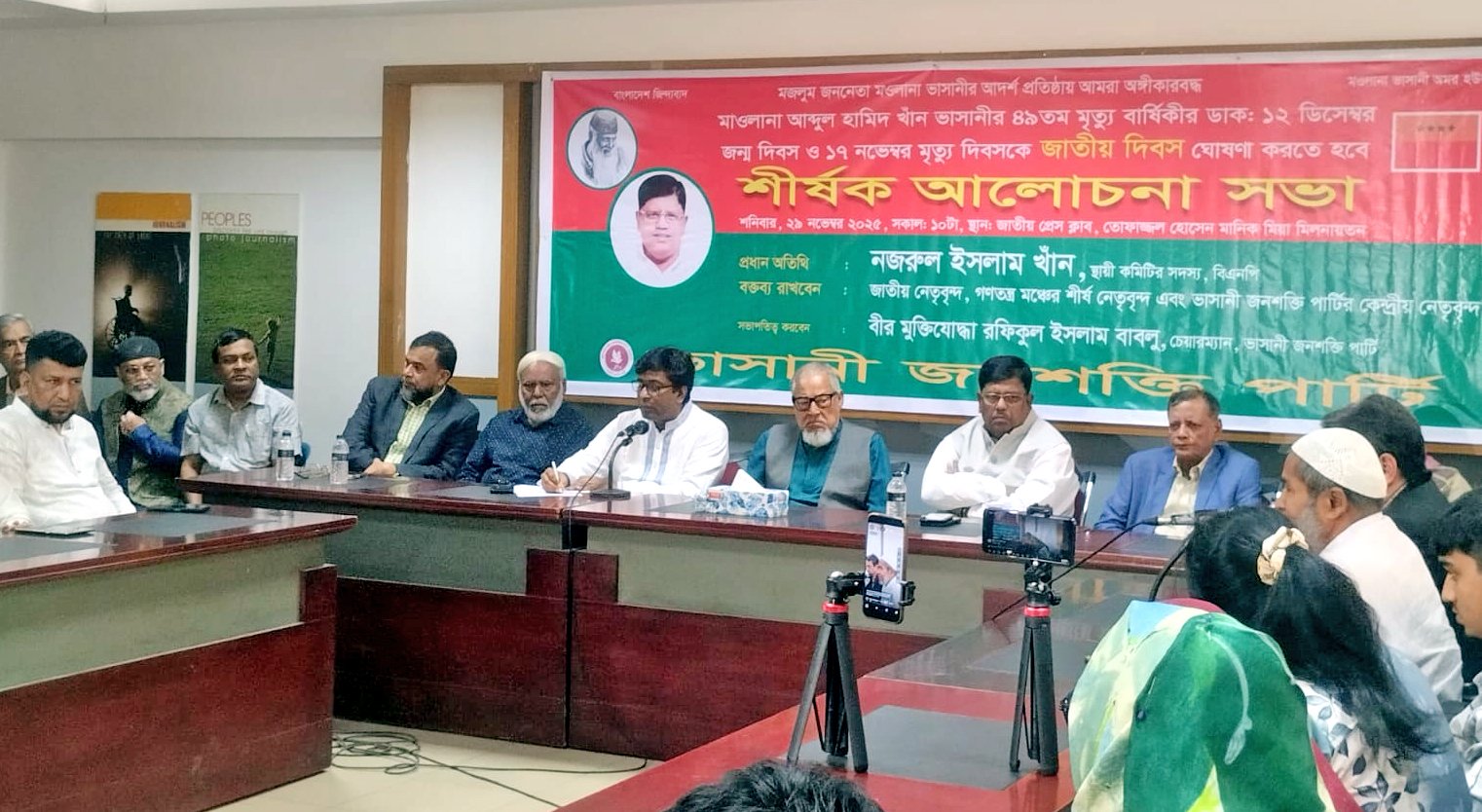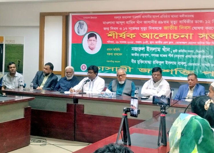২৯ নভেম্বর শনিবার ভাসানী জনশক্তি পার্টির উদ্যোগে জাতীয় প্রেসক্লাবের তোফাজ্জল হোসেন মানিক মিয়া মিলনায়তনে আলোচনা সভা অনুষ্ঠিত হয়েছে। ভাসানী জনশক্তি পার্টির চেয়ারম্যান বীর মুক্তিযোদ্ধা শেখ রফিকুল ইসলাম বাবলুর সভাপিত্বে এবং মহাসচিব ড. আবু ইউসুফ সেলিমের সঞ্চালনায় প্রধান অতিথি হিসাবে উপস্থিত ছিলেন বিএনপির স্থায়ী কমিটির সদস্য নজরুল ইসলাম খান।