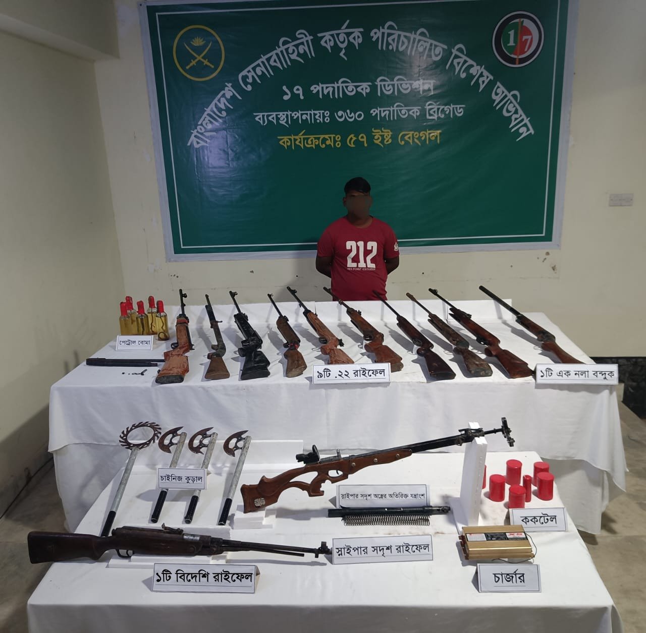 গ্রেফতারকৃতর সিএনজি চালকের নাম ঠিকানা প্রকাশ না করলেও সেনাবাহিনী জানিয়েছে অস্ত্রসহ জব্দকৃত যাবতীয় মালামাল শান্তিগঞ্জ থানায় জমা দেয়া হয়েছে।