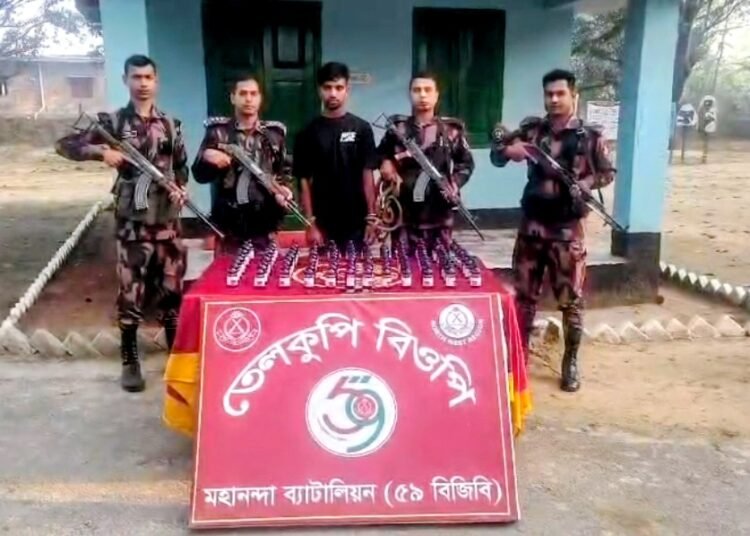 বৃহস্পতিবার ভোরে উপজেলার সীমান্তে জমিনপুর গ্রামে তেলকুপি বিওপির একটি চৌকস টহল দল এ অভিযান চালায় । আটক সাকিব ওই এলাকার মনিরুল ইসলামের ছেলে।