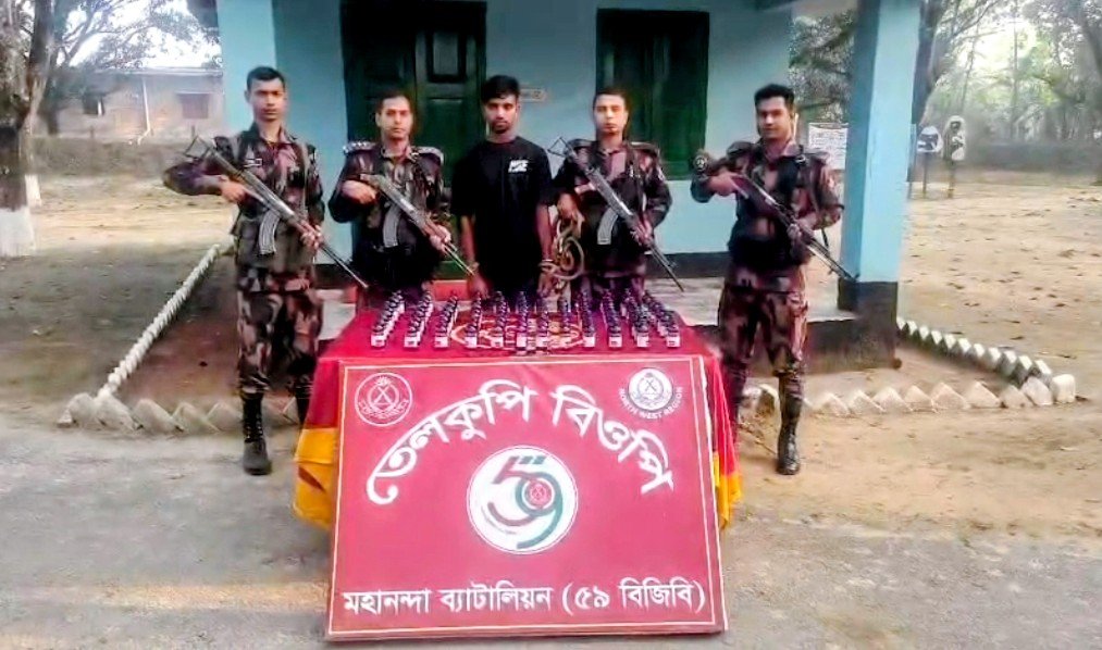 বৃহস্পতিবার ভোরে উপজেলার সীমান্তে জমিনপুর গ্রামে তেলকুপি বিওপির একটি চৌকস টহল দল এ অভিযান চালায় । আটক সাকিব ওই এলাকার মনিরুল ইসলামের ছেলে।