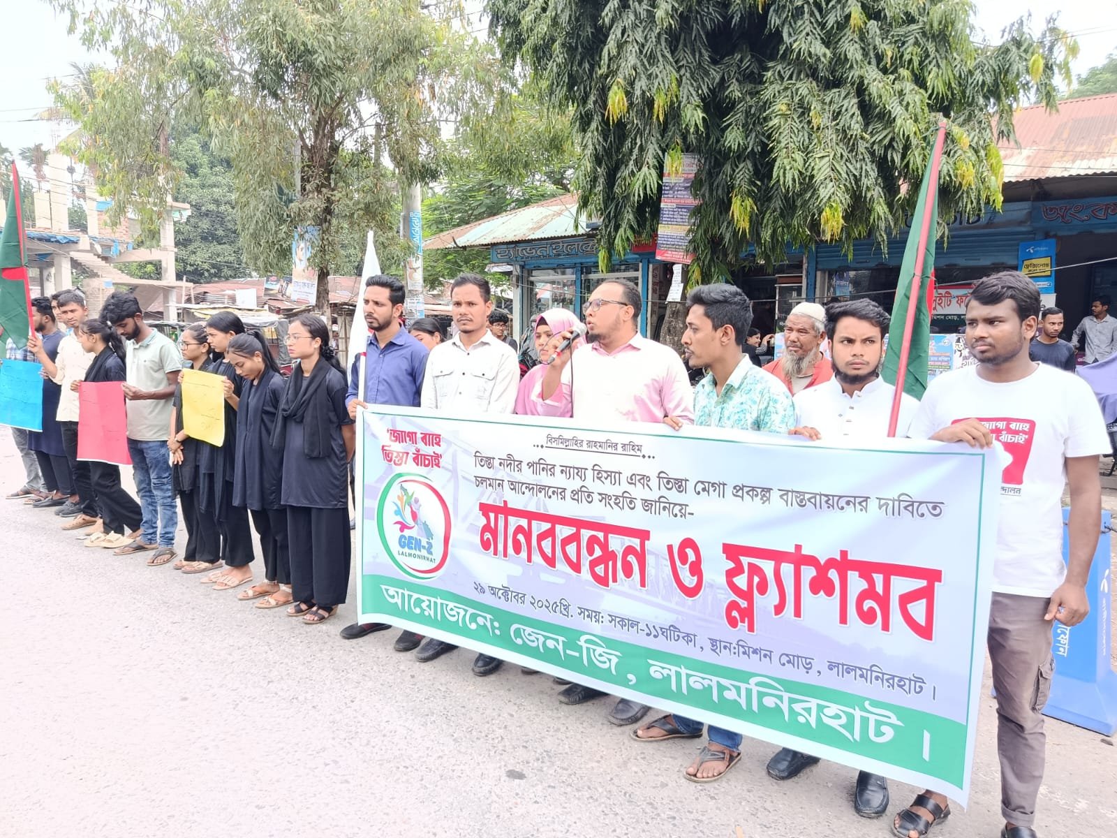 তিস্তা মহাপরিকল্পনা বাস্তবায়নের প্রতি সংহতি জানিয়ে তরুণদের সংগঠন জেন-জি লালমনিরহাট লালমনিরহাটের মিশন মোড়ে আয়োজন করে মানব বন্ধন ও ফ্লাস মব। এই ব্যতিক্রমী কর্মসূচির